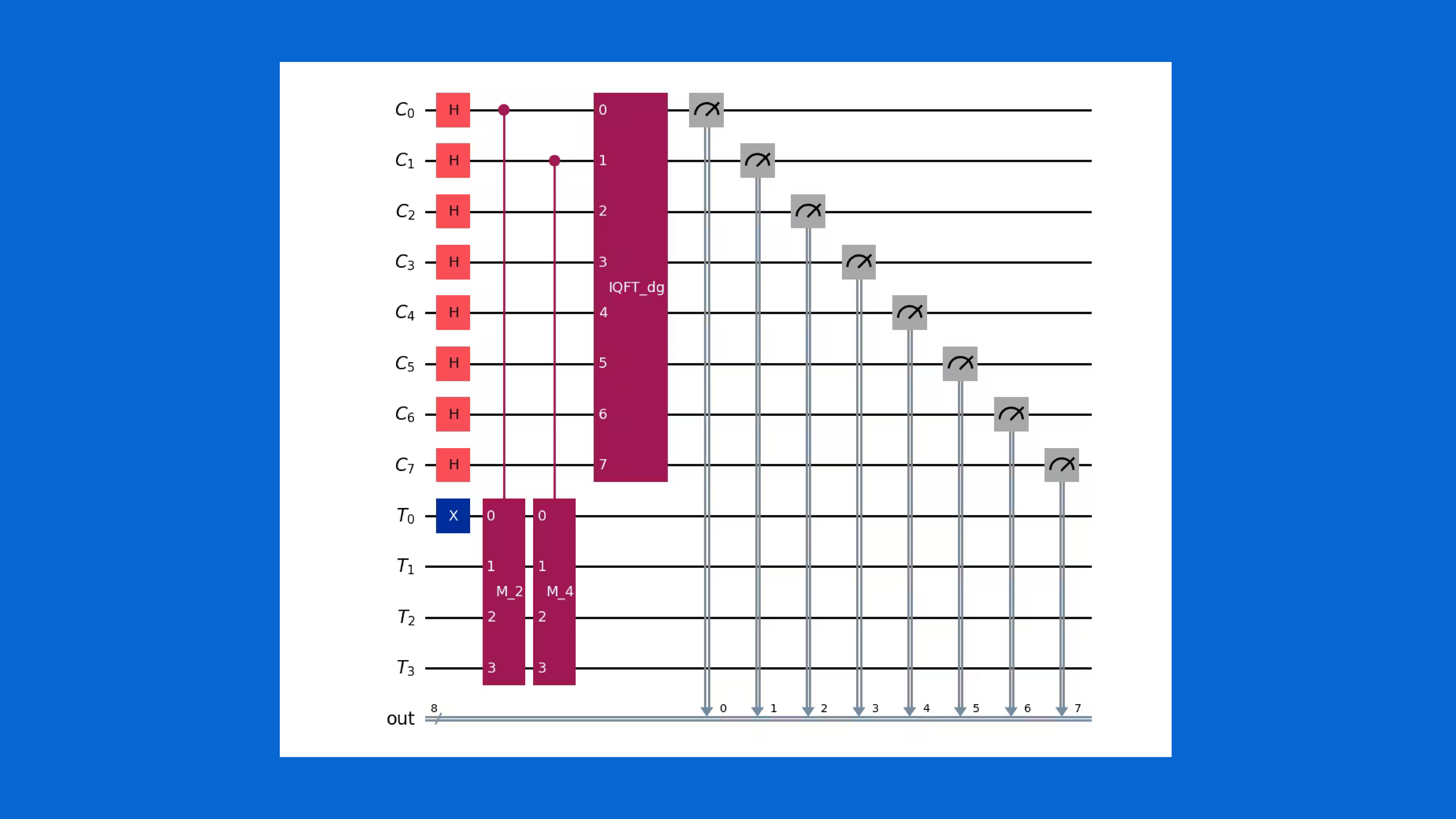 Tworzenie i testowanie algorytmów z pewnością ułatwiają biblioteki i frameworki stanowiące rozszerzenie popularnych języków programowania, jak choćby IBM Qiskit, gdzie do tworzenia obwodów kwantowych (ang. quantum circuit) wykorzystujemy składnię języka Python (a same obwody mogą być uruchamiane na emulatorach lub rzeczywistych komputerach kwantowych). Rysunek 2 przedstawia wizualizację przykładowego obwodu stworzonego na potrzeby implementacji algorytmu Shora realizującego podział na dwa czynniki liczby 15, którego pełen opis znajdziemy na stronie: https://quantum.cloud.ibm.com/docs/en/tutorials/shors-algorithm
